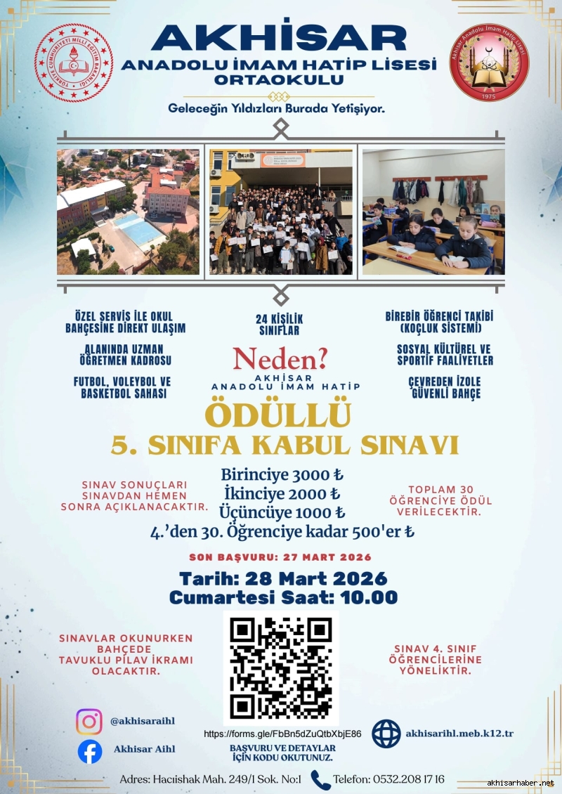 Akhisar Anadolu İmam Hatip Lisesi Ortaokulu, 5. sınıfa kabul için ödüllü sınav düzenliyor. 28 Mart Cumartesi günü yapılacak sınavda toplam 30 öğrenciye ödül verilecek.
