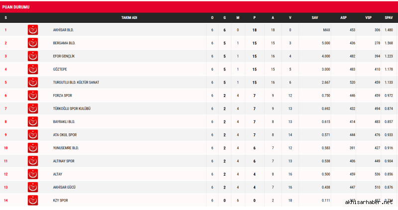 Türkiye Voleybol Federasyonu’nun resmi puan tablosuna göre Akhisar Belediyesi, 6 maç sonunda 18 puanla zirvede yer alırken, en yakın rakipleri Bergama Belediyesi, Efor Gençlik, Göztepe ve Turgutlu Belediyesi 15’er puanla takip ediyor.