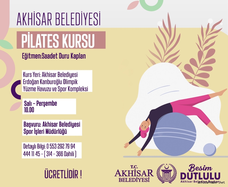 Akhisar Belediyesi, kent sakinlerinin sağlıklı ve aktif yaşam sürmelerini desteklemek amacıyla ücretli pilates kursu düzenliyor. Eğitmen Saadet Duru Kaplan tarafından verilecek kurslar, Akhisar Belediyesi Erdoğan Kanburoğlu Olimpik Yüzme Havuzu ve Spor Kompleksi’nde gerçekleştirilecek.