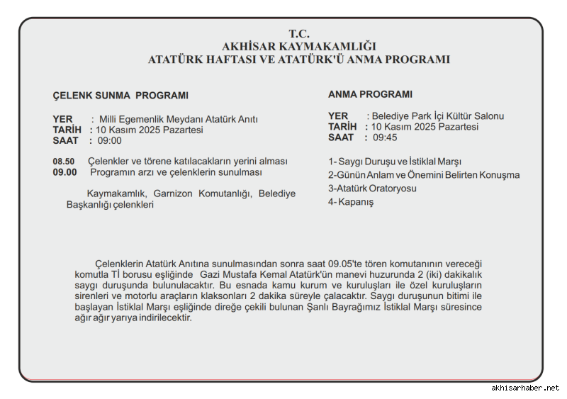 Program, 10 Kasım Pazartesi sabahı saat 09.00’da Milli Egemenlik Meydanı’ndaki Atatürk Anıtı’na çelenk sunma töreni ile başlayacak. Kaymakamlık, Garnizon Komutanlığı ve Belediye Başkanlığı çelenklerinin sunulmasının ardından saat 09.05’te tüm Akhisar’da sirenler eşliğinde iki dakikalık saygı duruşunda bulunulacak. Bu sırada kamu kurumları, özel kuruluşlar ve motorlu araçlar kornalarıyla saygı duruşuna eşlik edecek. Tören, İstiklal Marşı’nın okunması ve bayrağın yarıya indirilmesiyle sona erecek.