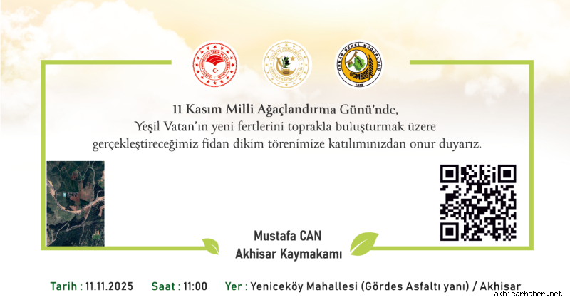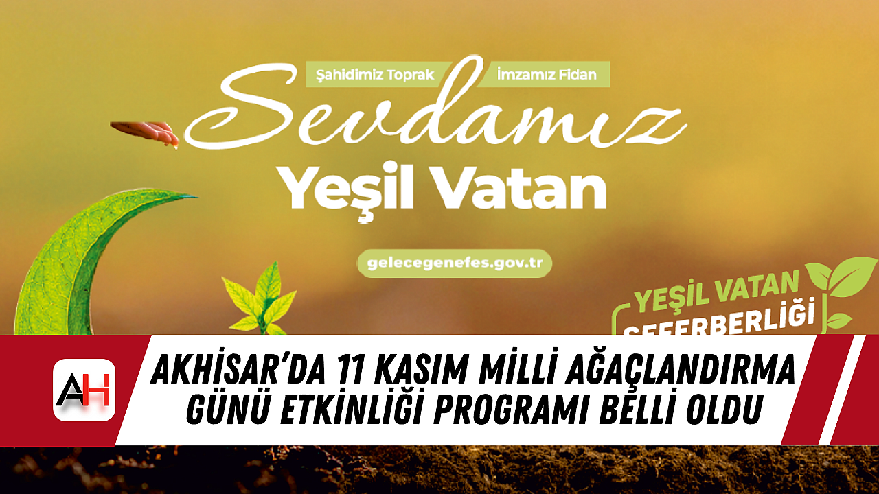 Manisa’nın Akhisar ilçesinde, 11 Kasım Milli Ağaçlandırma Günü kapsamında “Sevdamız Yeşil Vatan” temalı fidan dikim etkinliği düzenlenecek. Akhisar Kaymakamı Mustafa Can’ın öncülüğünde gerçekleştirilecek olan etkinlik, Yeniceköy Mahallesi’nde, Gördes Asfaltı yanında saat 11.00’de başlayacak.