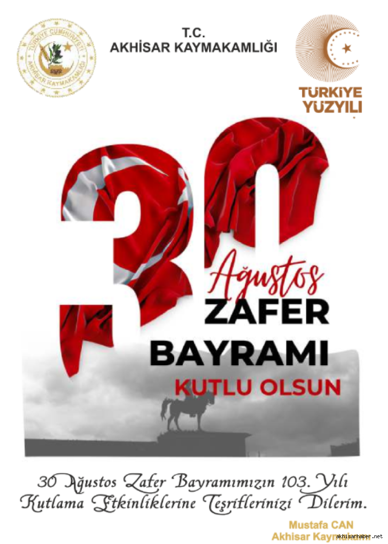 Akhisar Kaymakamlığı, 30 Ağustos Zafer Bayramı’nın 103. yılı dolayısıyla düzenlenecek kutlama programını duyurdu. Kaymakam Mustafa Can, yayımladığı davet mesajında vatandaşları kutlama etkinliklerine katılmaya davet ederek, “30 Ağustos Zafer Bayramımızın 103. yılı kutlama etkinliklerine teşriflerinizi dilerim” ifadelerine yer verdi.