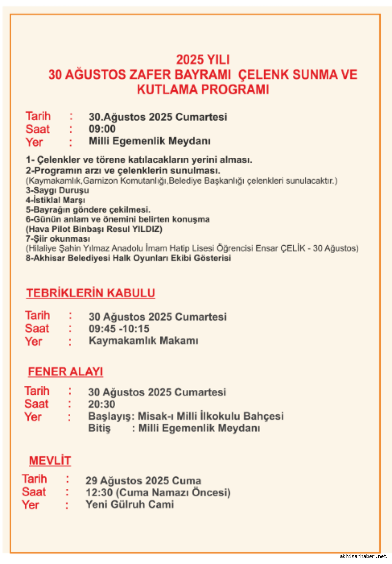 Kutlamalar, 30 Ağustos Cumartesi günü saat 09.00’da Milli Egemenlik Meydanı’nda çelenk sunma töreni ile başlayacak. Kaymakamlık, Garnizon Komutanlığı ve Belediye Başkanlığı’nın çelenk sunumunun ardından saygı duruşu ve İstiklal Marşı ile program devam edecek. Bayrağın göndere çekilmesiyle birlikte günün anlam ve önemine dair konuşmalar yapılacak, şiirler okunacak ve Akhisar Belediyesi Halk Oyunları Ekibi gösteri sunacak.