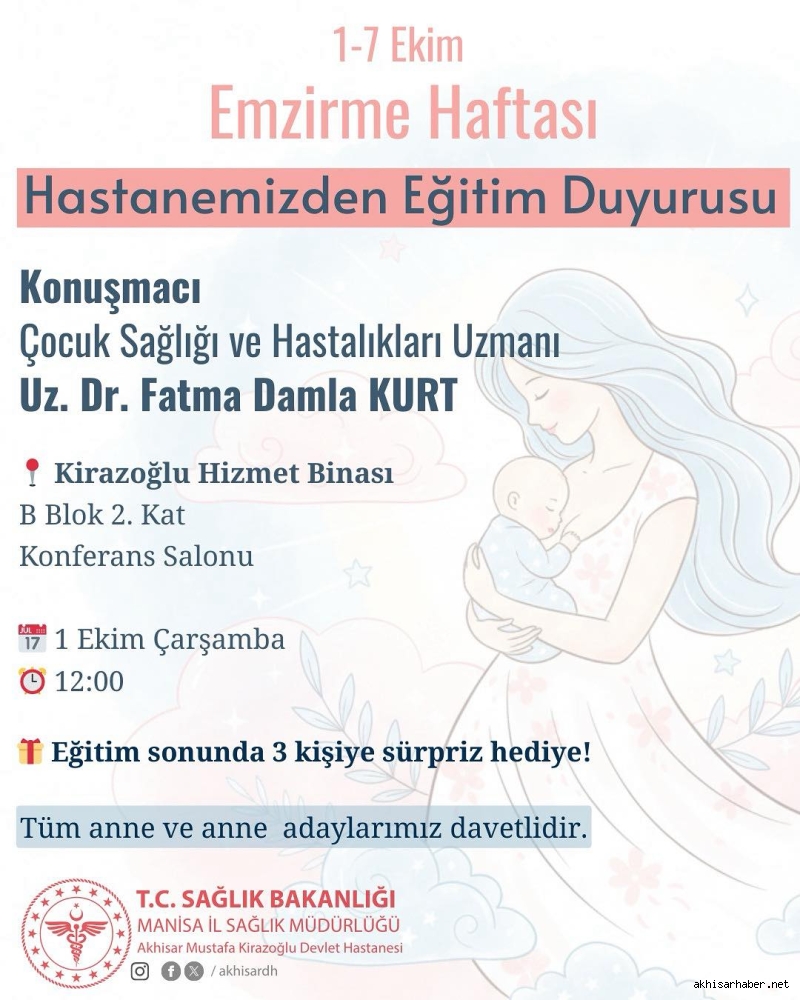 1-7 Ekim Emzirme Haftası etkinlikleri kapsamında Akhisar Mustafa Kirazoğlu Devlet Hastanesi’nde annelere ve anne adaylarına yönelik bilgilendirici bir eğitim programı düzenlenecek.