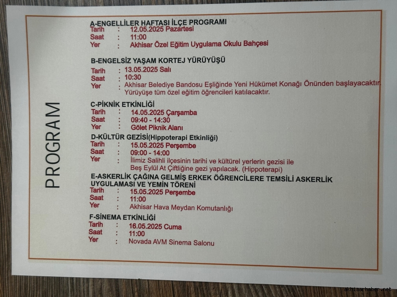 - 13 Mayıs Salı - Engelsiz Yaşam Kortej Yürüyüşü: Saat 10.30’da Akhisar Belediye Bandosu eşliğinde Yeni Hükümet Konağı önünden yürüyüş başlayacak. Tüm özel eğitim okulları bu anlamlı yürüyüşe katılacak.