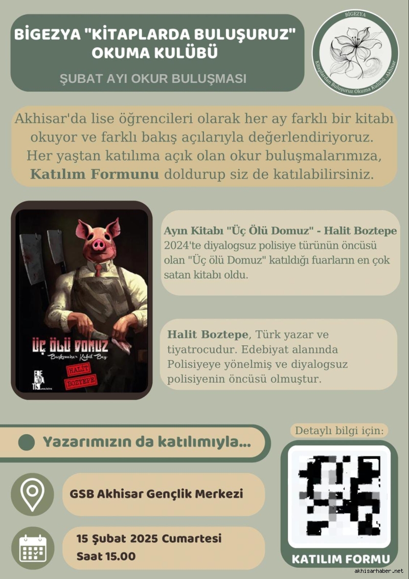 Akhisar'da lise öğrencilerinin öncülüğünde her ay düzenlenen "BİGEZYA Kitaplarda Buluşuruz" okuma kulübü etkinliği, bu ay GSB Akhisar Gençlik Merkezi'nde gerçekleşti. 15 Şubat 2025 Cumartesi günü saat 15.00’te düzenlenen etkinlikte, Halit Boztepe’nin "Üç Ölü Domuz" adlı kitabı ele alındı.