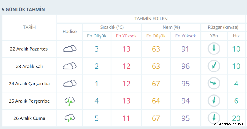 Meteoroloji verilerine göre Akhisar’da önümüzdeki günlerde hava çok bulutlu olacak, Perşembe ve Cuma günleri ise sağanak yağış etkili olacak. Özellikle nem oranlarının yüzde doksanların üzerine çıkmasıyla birlikte yağışların yer yer kuvvetli hissedilmesi bekleniyor.
