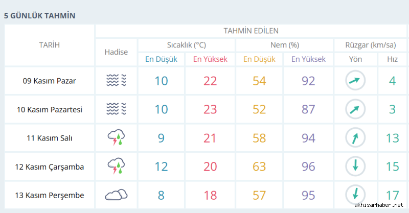 11 Kasım Salı ve 12 Kasım Çarşamba günleri ise gök gürültülü sağanak yağış bekleniyor.