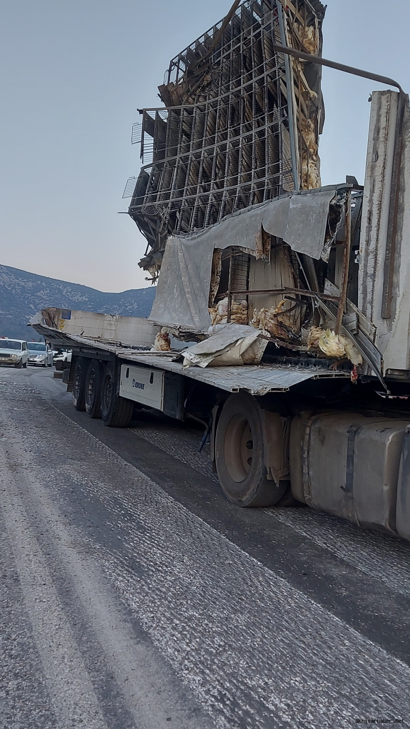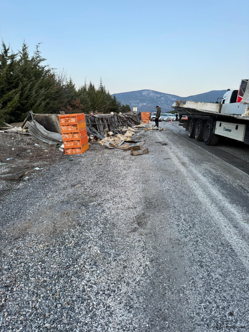 Manisa’nın Akhisar ilçesi Gördes yolu üzeri Doğankaya Mahallesi mevkiinde tavuk yüklü bir tırın devrilmesi sonucu çok sayıda tavuk telef oldu. Kazanın henüz belirlenemeyen bir nedenle meydana geldiği öğrenildi.