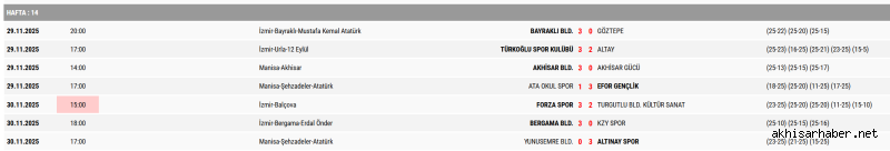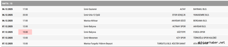 Ligin 15. haftasında Akhisar Belediyespor, deplasmanda Altınay Spor ile karşılaşacak. Akhisar Gücü ise kendi sahasında Bergama Belediyespor’u ağırlayacak.