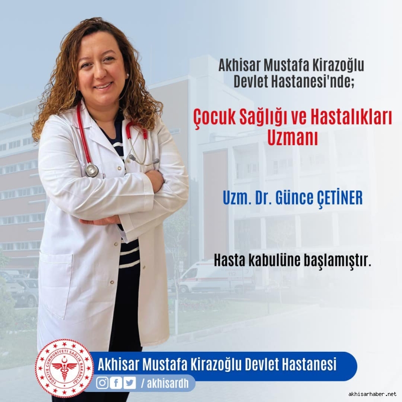 Akhisar Mustafa Kirazoğlu Devlet Hastanesi, sağlık hizmetlerini güçlendirmeye devam ediyor. Hastanede Radyoloji Uzmanı Uz. Dr. Erhan Fırat ve Çocuk Sağlığı ve Hastalıkları Uzmanı Uz. Dr. Günce Çetiner hasta kabulüne başladı.