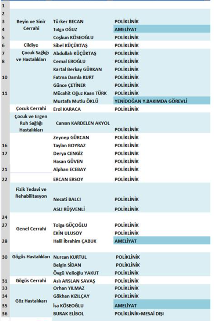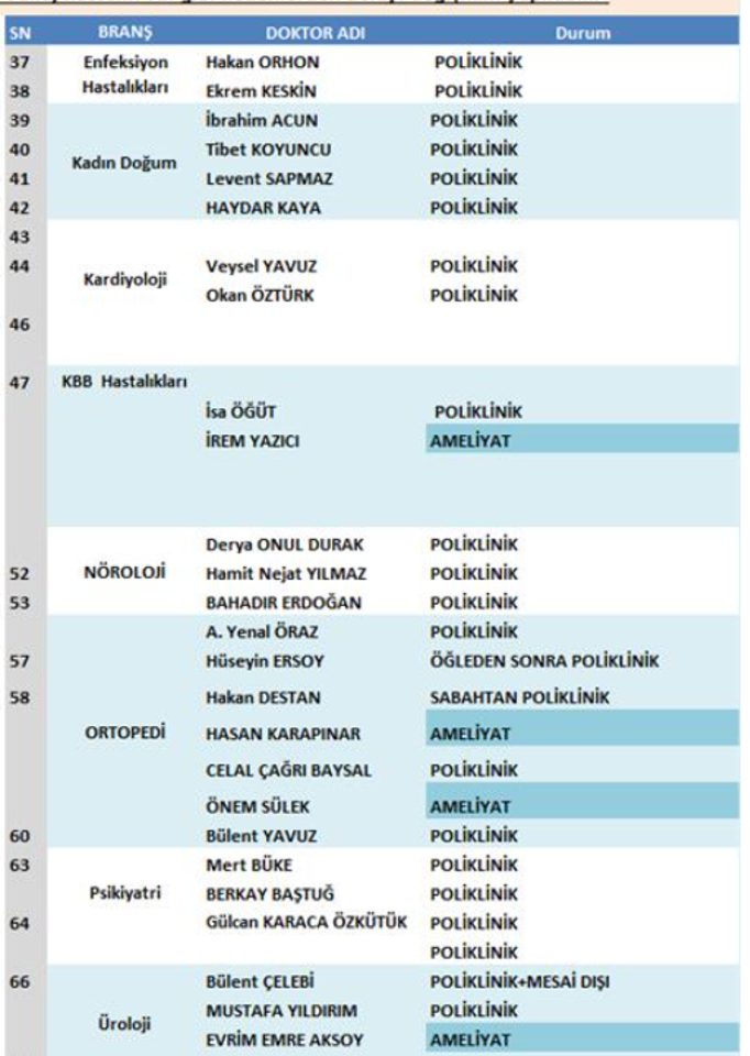 Hastanede çeşitli branşlarda görev yapan doktorların çalışma durumları şu şekilde: