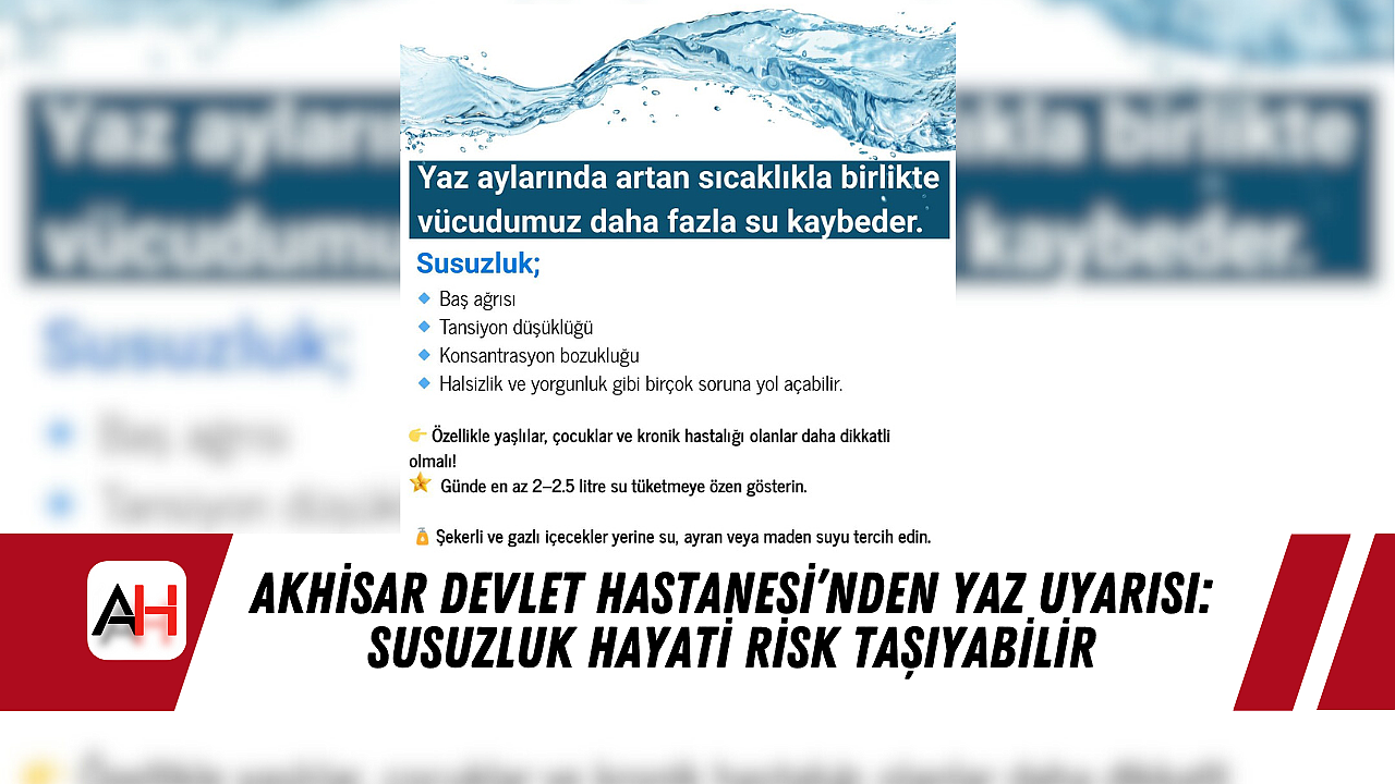 Yaz aylarında artan sıcaklıklarla birlikte vücudun su ihtiyacı da önemli ölçüde artıyor. Akhisar Mustafa Kirazoğlu Devlet Hastanesi, vatandaşları sıcak havalarda su tüketimi konusunda uyardı. Hastane tarafından paylaşılan bilgilendirme görsellerinde, susuzluğun yol açabileceği başlıca sağlık sorunlarına dikkat çekildi.