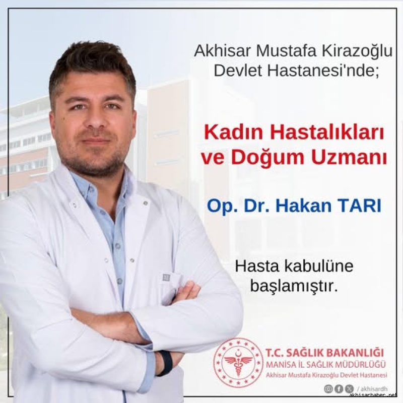 Akhisar Mustafa Kirazoğlu Devlet Hastanesi, sağlık kadrosunu güçlendirmeye devam ediyor. Kadın sağlığı alanında önemli bir adım daha atan hastane, Kadın Hastalıkları ve Doğum Uzmanı Op. Dr. Hakan Tarı’nın hasta kabulüne başladığını duyurdu. Hastane yönetimi, bölge halkına daha hızlı, güvenilir ve kaliteli sağlık hizmeti sunmak amacıyla uzman kadrolarını genişlettiklerini belirtti.