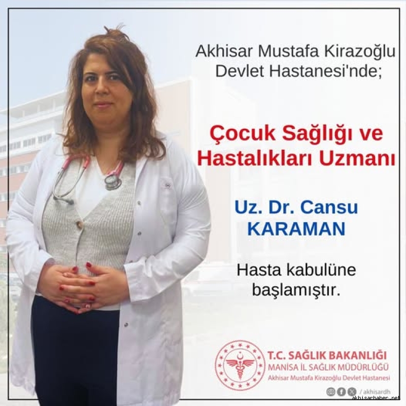 Akhisar Mustafa Kirazoğlu Devlet Hastanesi hekim kadrosunu güçlendirmeye devam ediyor. Çocuk Sağlığı ve Hastalıkları Uzmanı Uz. Dr. Cansu Karaman, hastanede hasta kabulüne başladı.