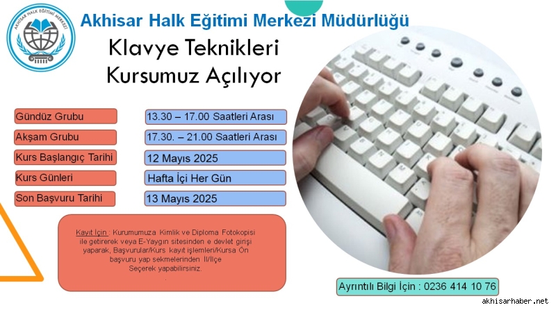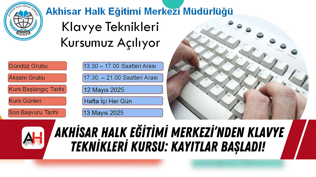 Akhisar Halk Eğitimi Merkezi Müdürlüğü, hızlı ve doğru klavye kullanımı becerisi kazanmak isteyenler için yeni bir kurs duyurusu yaptı. Klavye Teknikleri Kursu, hem gündüz hem de akşam gruplarıyla 12 Mayıs 2025 tarihinde başlayacak. Başvuru süreci ise 13 Mayıs 2025 tarihine kadar devam edecek.
