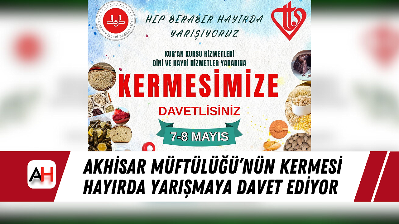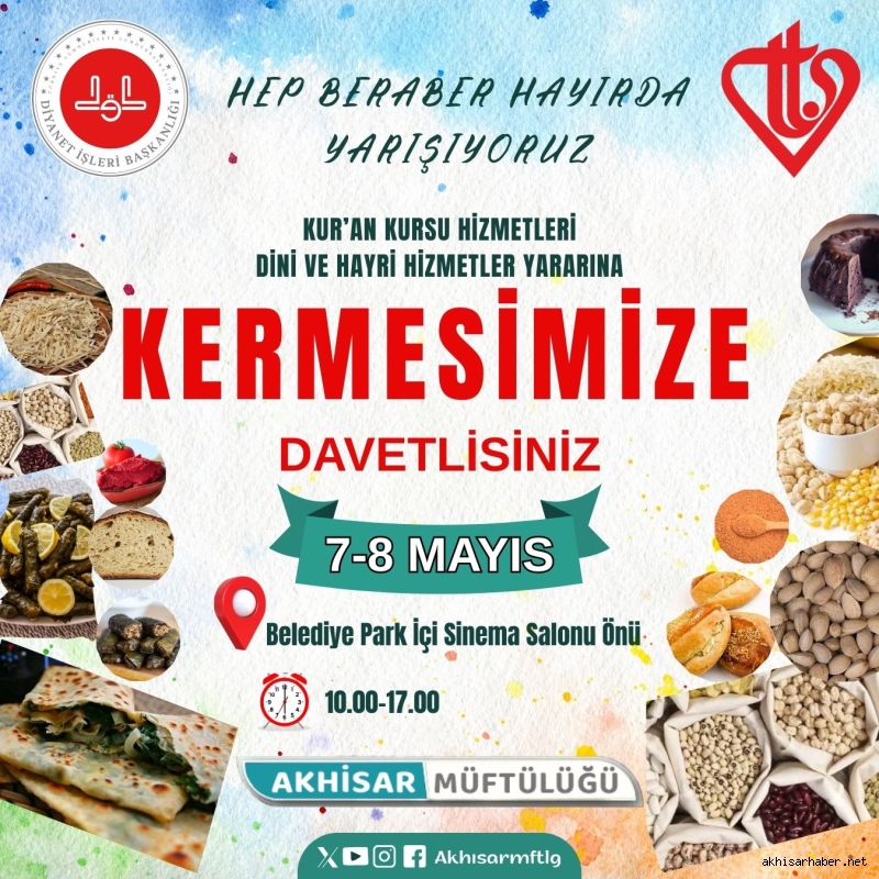 Akhisar Müftülüğü ve Türkiye Diyanet Vakfı (TDV) Akhisar Şubesi iş birliğiyle düzenlenen geleneksel kermes, 7-8 Mayıs tarihlerinde Belediye Park İçi Sinema Salonu önünde gerçekleştirilecek. "Hep beraber hayırda yarışıyoruz" sloganıyla düzenlenen bu anlamlı etkinlikte elde edilen tüm gelirler, Kur’an kursları ve dini-hayri hizmetlerin desteklenmesinde kullanılacak.