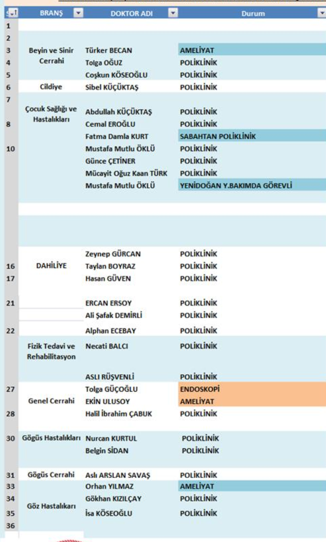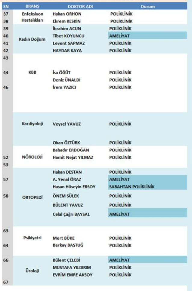 Dahiliye, Ortopedi, KBB, Göz Hastalıkları, Psikiyatri, Nöroloji, Fizik Tedavi gibi birçok branşta poliklinik hizmeti devam ederken; sabah polikliniği görevi olan hekimler de ilgili sütunlarda belirtildi.