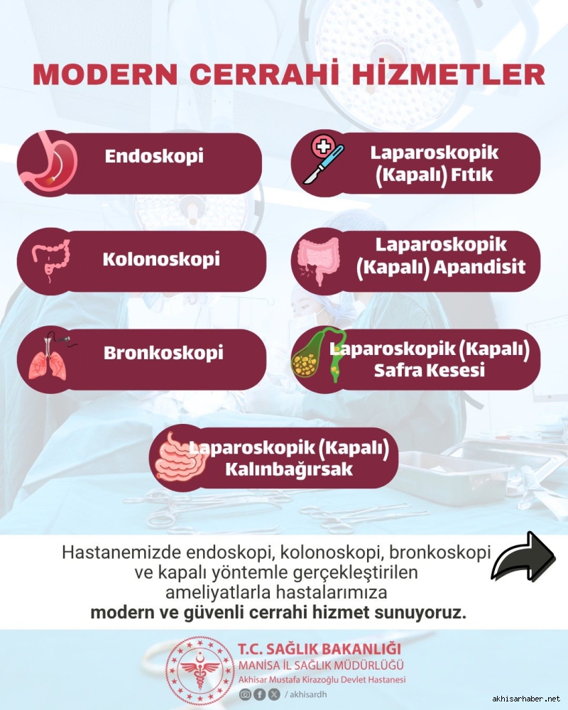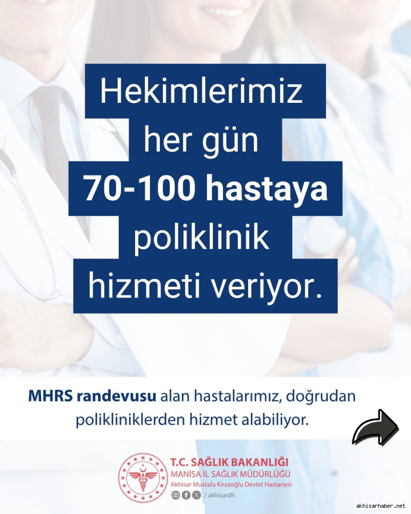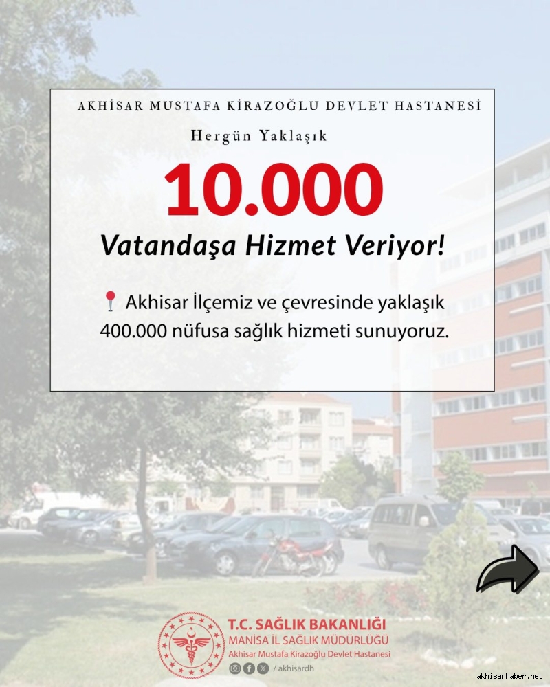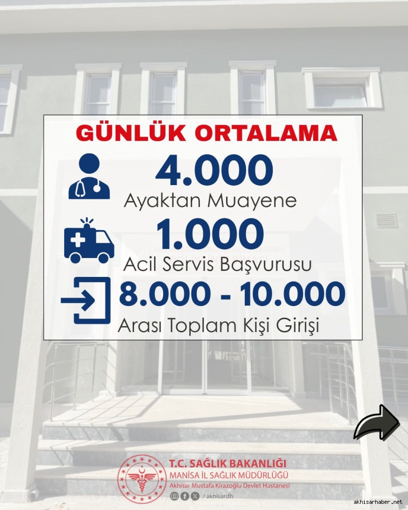 Akhisar Mustafa Kirazoğlu Devlet Hastanesi, çevre ilçelerle birlikte yaklaşık 400 bin kişiye sağlık hizmeti sunmaya devam ediyor. Hastane, her gün ortalama 4 bin poliklinik başvurusu ve yaklaşık 1.000 acil servis müracaatı ile 8 ila 10 bin arası vatandaşın sağlık ihtiyacına cevap veriyor.