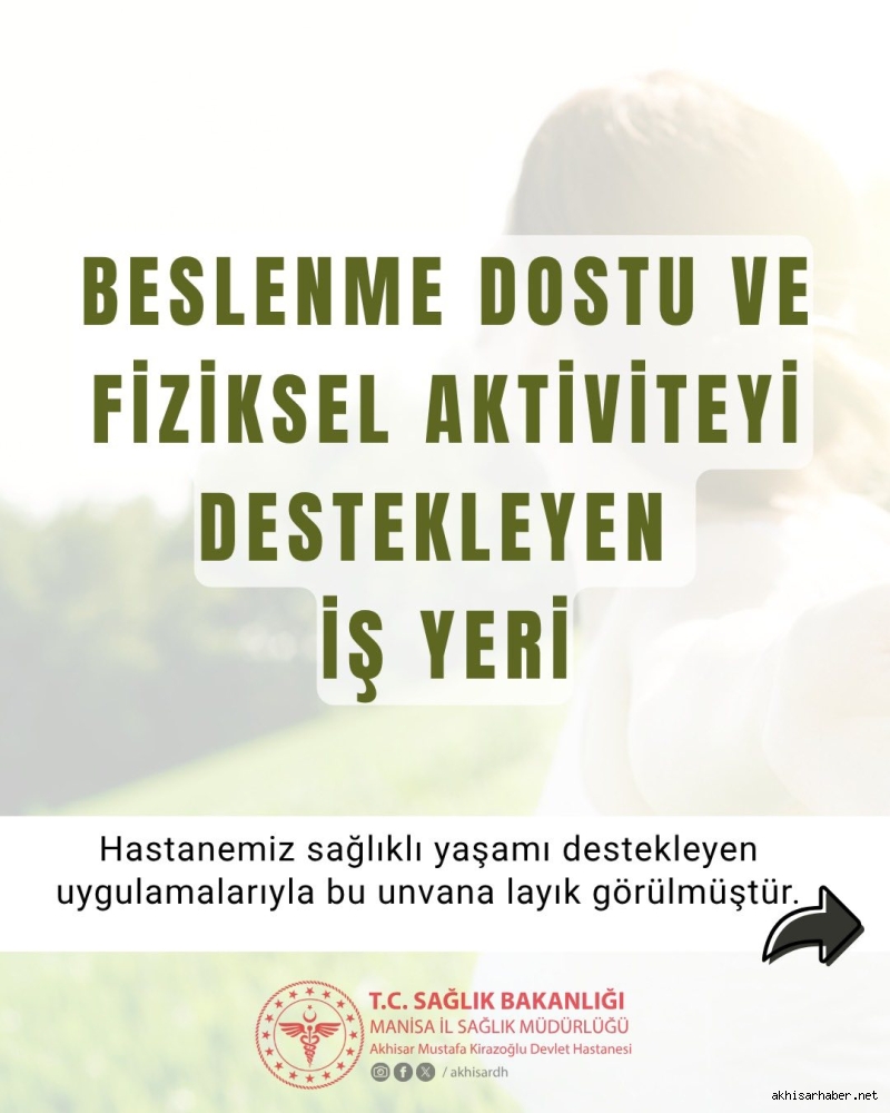 Yapılan değerlendirmeler sonucunda “Beslenme Dostu ve Fiziksel Aktiviteyi Destekleyen İş Yeri” unvanını kazanan Akhisar Mustafa Kirazoğlu Devlet Hastanesi, vatandaşların MHRS randevusu ile doğrudan polikliniklerden hızlı ve güvenli şekilde hizmet almasına imkân tanıyor.