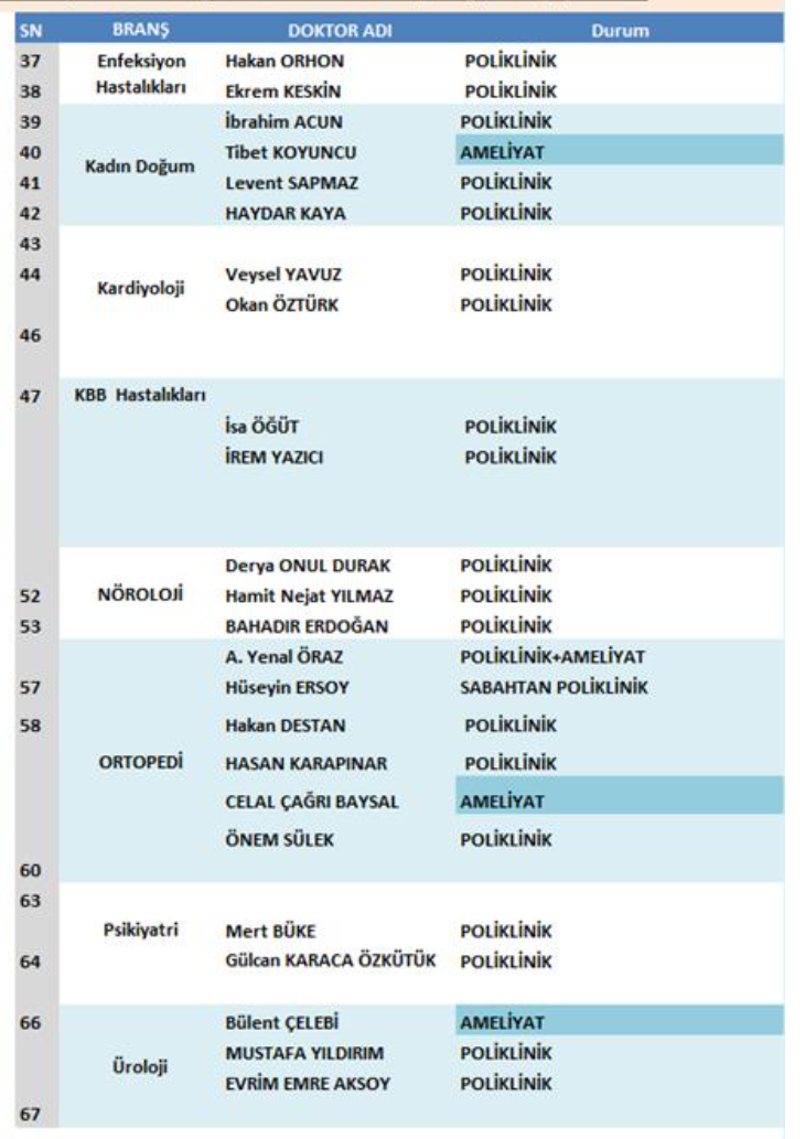 Manisa İl Sağlık Müdürlüğü’ne bağlı Akhisar Mustafa Kirazoğlu Devlet Hastanesi’nde 6 Mayıs 2025 Salı günü görev yapacak doktorların çalışma takvimi açıklandı. Hastane yönetimi tarafından paylaşılan listeye göre, poliklinik hizmeti sunacak doktorlar branşlarına göre belirlenirken, bazı doktorların ameliyat ve doğum gibi görevlerde olacağı bildirildi. Vatandaşların, muayene veya diğer işlemleri için hastaneye başvurmadan önce bu listeyi dikkate alarak plan yapmaları önerildi.