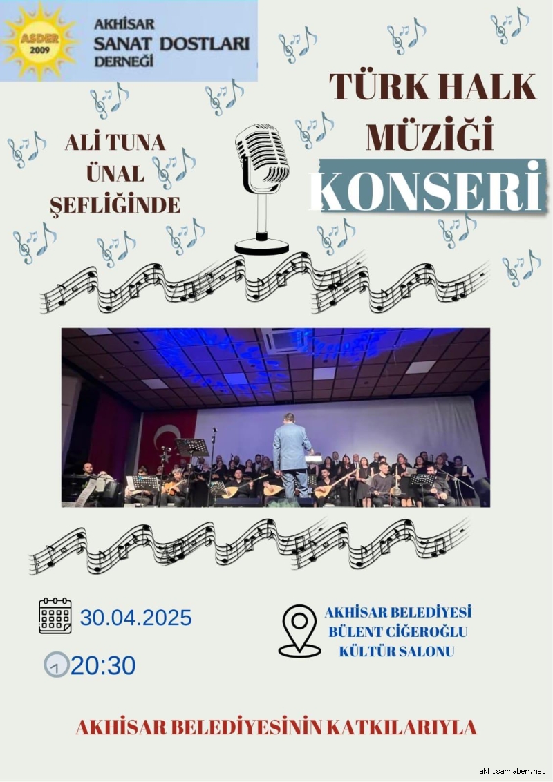 Akhisar Sanat Dostları Derneği (ASDER) tarafından düzenlenen Türk Halk Müziği Konseri, 30 Nisan 2025 Çarşamba akşamı müzikseverlerle buluşacak.