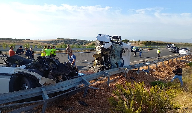 Kaza, İzmir-İstanbul Otoyolu'nun Saruhanlı ilçesi geçişinde meydana geldi. 45 KL 540 plakalı hafriyat kamyonu, A.Ö. idaresindeki 35 TBD 25 plakalı talaş yüklü kamyona arkadan çarptı. Çarpmanın etkisiyle savrulan hafriyat kamyonunun kupası, bariyerlere çarparak yerinden koparak devrildi.