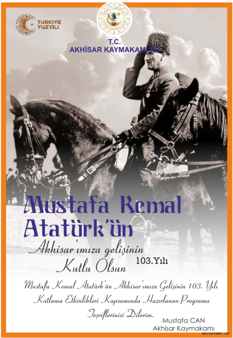 Akhisar Kaymakamı Mustafa Can imzasıyla yapılan davette, tüm vatandaşlar Atatürk’ün Akhisar’a gelişinin 103. yılı dolayısıyla düzenlenen programa davet edildi.