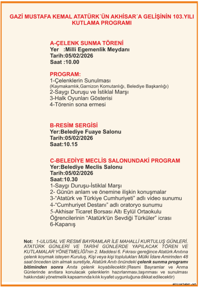 Akhisar Kaymakamlığı, Gazi Mustafa Kemal Atatürk’ün Akhisar’a gelişinin 103. yılı dolayısıyla kapsamlı bir kutlama programı hazırladı. 5 Şubat 2026 Perşembe günü gerçekleştirilecek programda çelenk sunma töreni, resim sergisi ve çeşitli etkinlikler yer alacak.