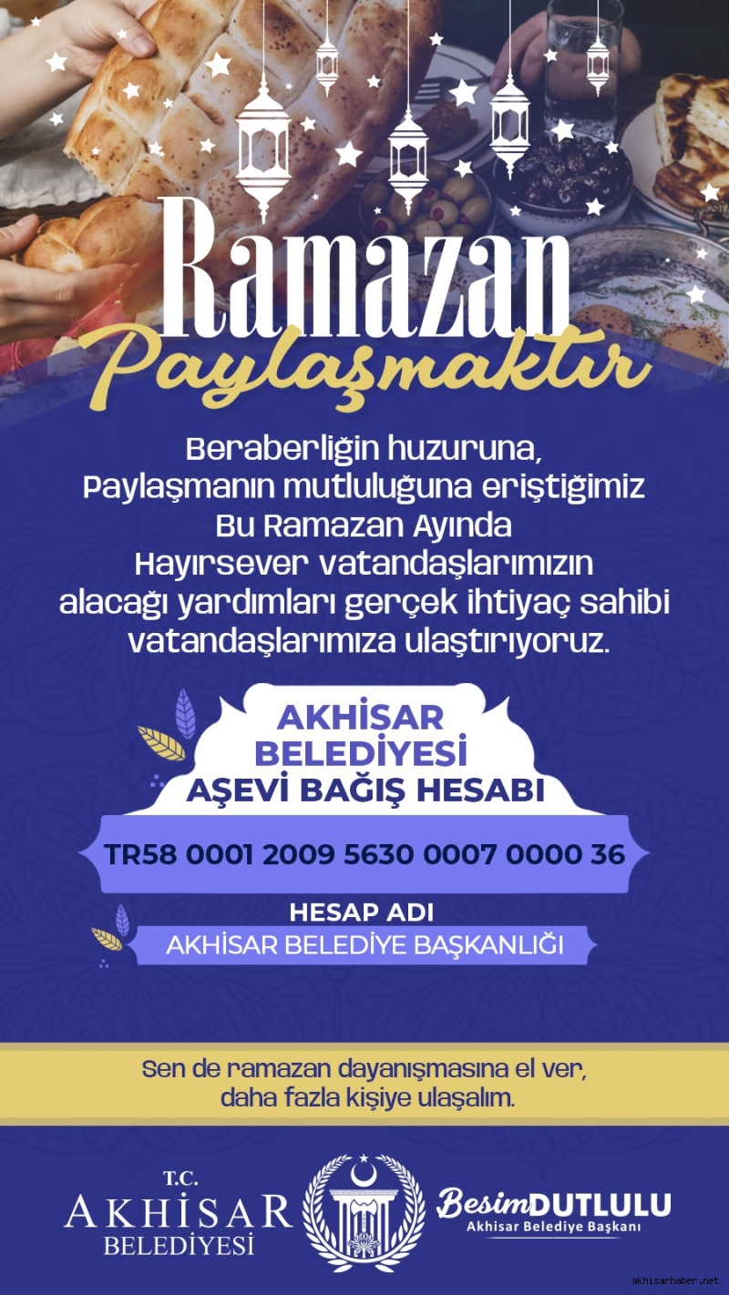 Başkan Besim Dutlulu, hayırsever vatandaşlara çağrıda bulunarak, Ramazan ayının paylaşma ve dayanışma ayı olduğunu vurguladı. Akhisar Belediyesi Aşevi’nin her gün yüzlerce aileye sıcak yemek ulaştıracağını belirterek, bağış yapmak isteyen vatandaşların 444 11 45 numaralı belediye hattı üzerinden Sosyal Yardım İşleri Müdürlüğü’ne ulaşarak detaylı bilgi alabileceğini ifade etti.