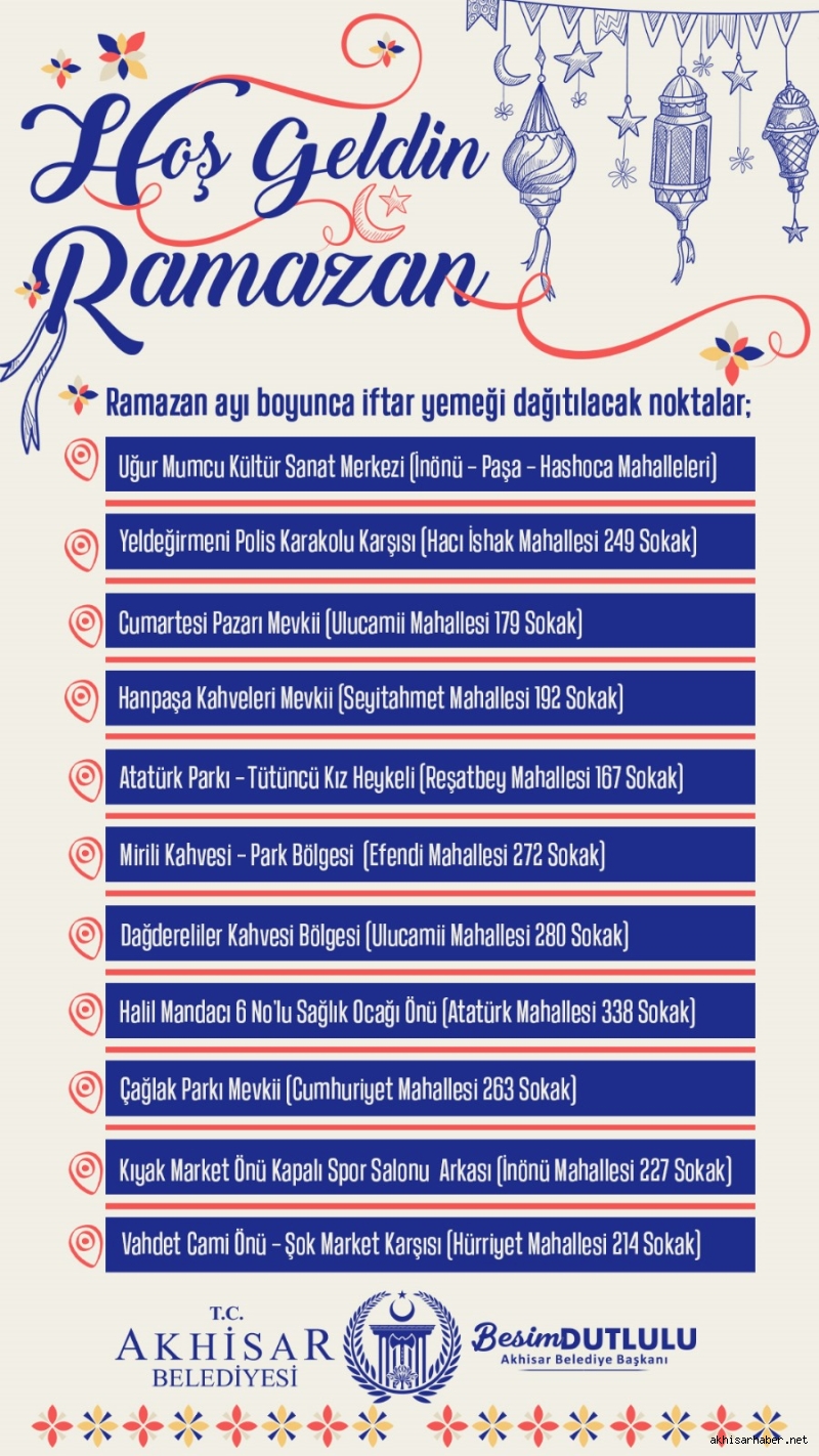 Akhisar Belediye Başkanı Besim Dutlulu, ramazan ayının yaklaşmasıyla birlikte ilçede geleneksel hale gelen iftar yemeği dağıtım noktalarını duyurdu. 1 Mart Cumartesi günü başlayacak mübarek ay boyunca, ihtiyaç sahiplerine 11 farklı noktada sıcak yemek dağıtımı yapılacak.