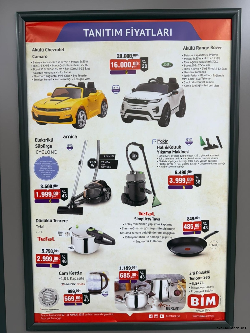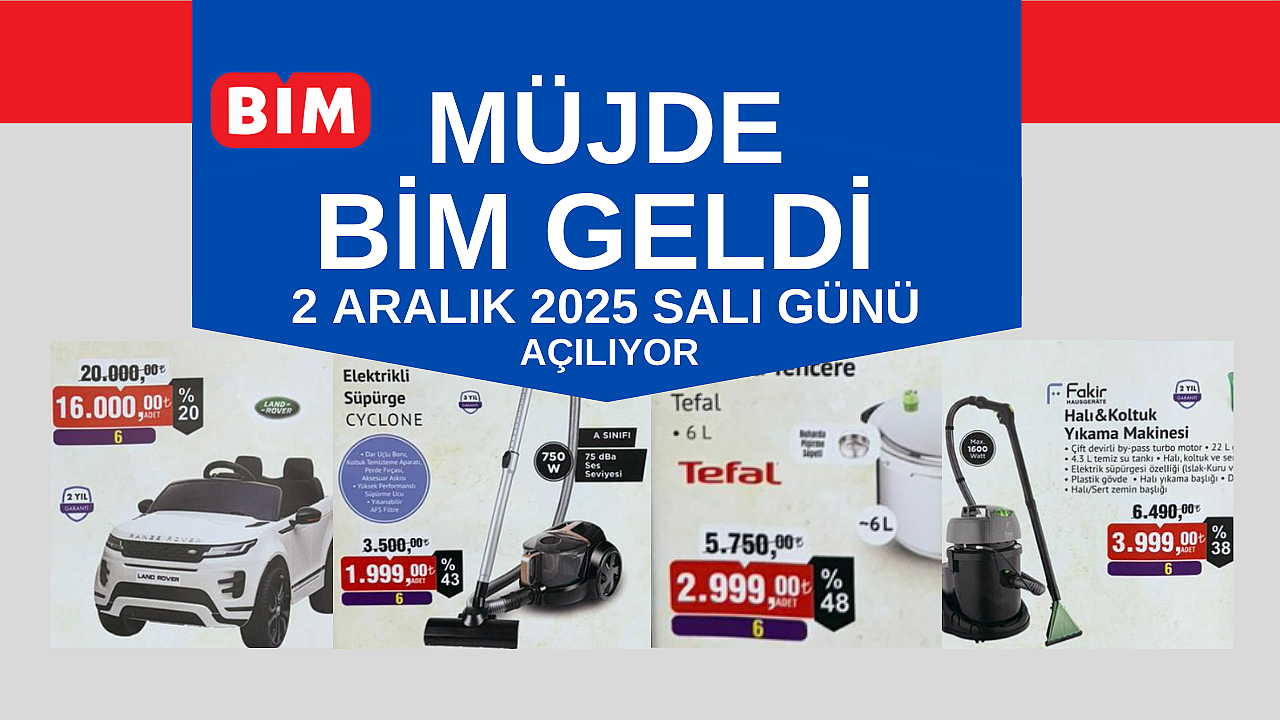 Açılış günü BİM, vatandaşlara geniş kapsamlı indirim listesi sunacak. Mutfak, temizlik, beyaz eşya, küçük ev aletleri ve çocuk ürünlerinde dikkat çekici fırsatlar yer alıyor. Marketin açılış kataloğunda 5 litre Mutfağım Konağı yağı 249 TL, Tefal 6 litre düdüklü tencere 5.750 TL yerine 2.999 TL, Arnica elektrikli süpürge 3.500 TL yerine 1.999 TL, Lotus koltuk 599 TL yerine 345 TL, plaj sandalyesi 299 TL yerine 169 TL fiyatlarla satışa sunulacak.
