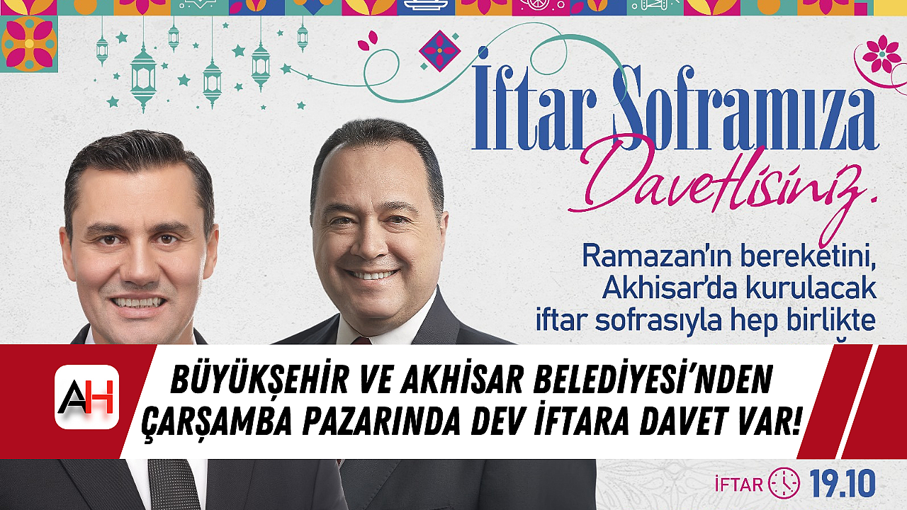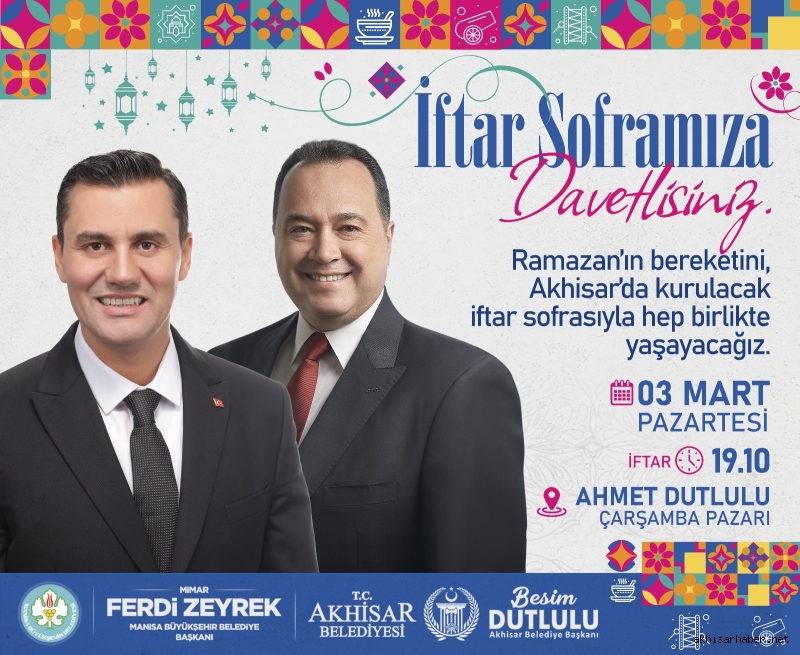 Akhisar Belediyesi, Ramazan ayının manevi atmosferini paylaşmak amacıyla 3 Mart Pazartesi günü büyük bir iftar organizasyonu düzenliyor. Manisa Büyükşehir Belediye Başkanı Ferdi Zeyrek ve Akhisar Belediye Başkanı Besim Dutlulu’nun ev sahipliğinde gerçekleştirilecek olan iftar programı, Ahmet Dutlulu Çarşamba Pazarı’nda kurulacak.
