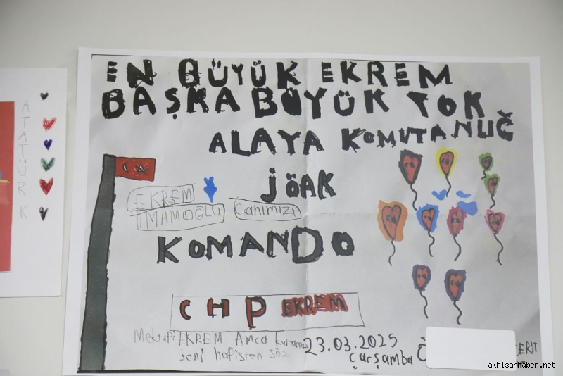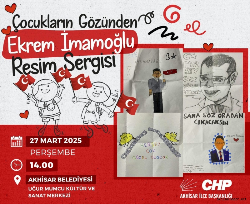 Cumhuriyet Halk Partisi Akhisar İlçe Başkanlığı tarafından düzenlenen ve çocukların çizdiği resimlerden oluşan “Çocukların Gözünden Ekrem İmamoğlu” temalı resim sergisi, 27 Mart 2025 Perşembe günü saat 14.00’te Akhisar Belediyesi Uğur Mumcu Kültür ve Sanat Merkezi’nde açıldı.