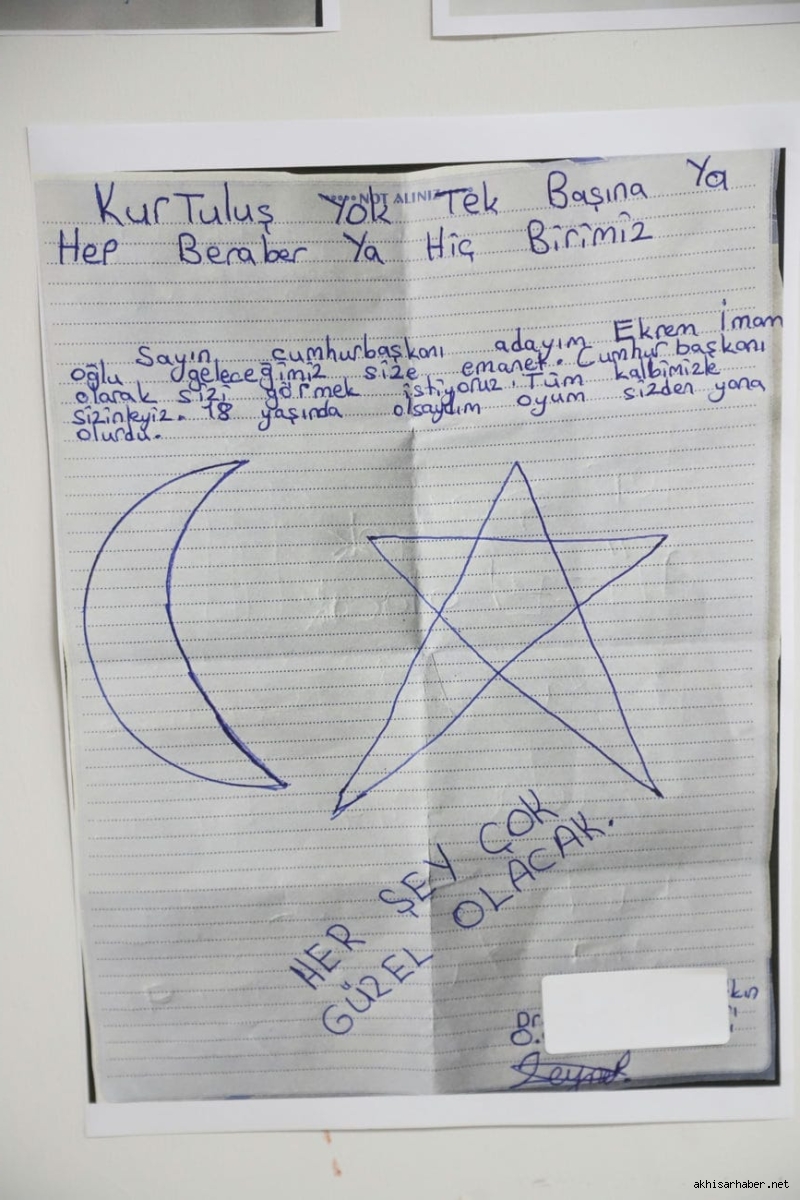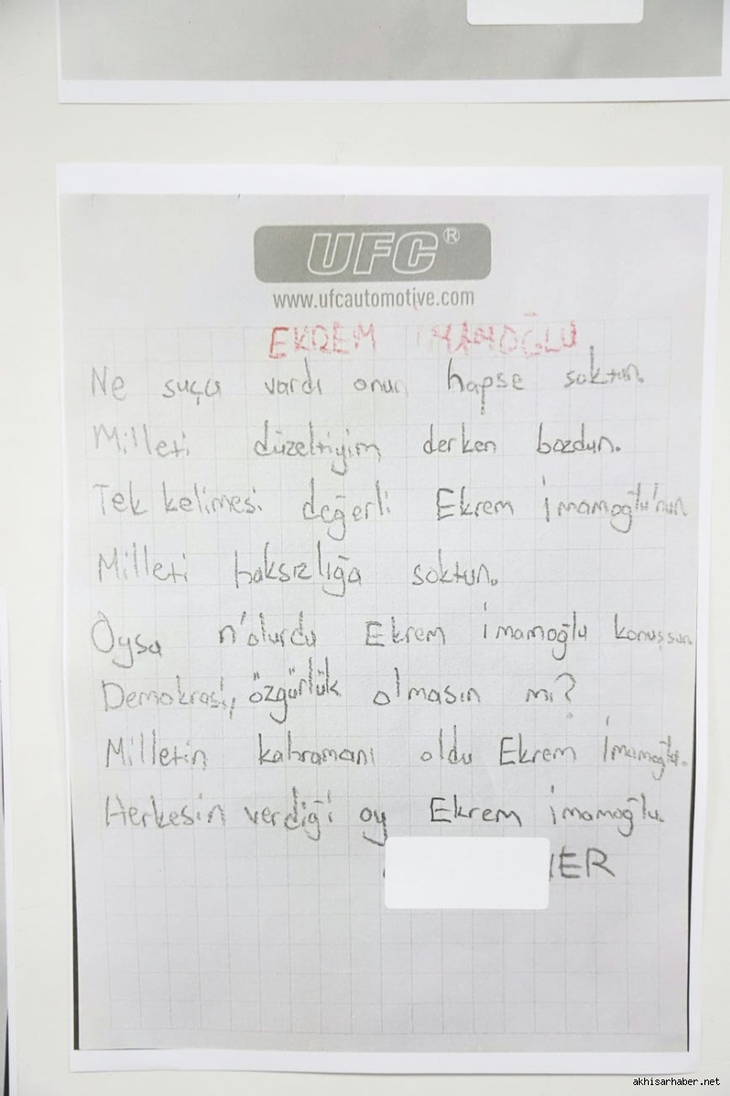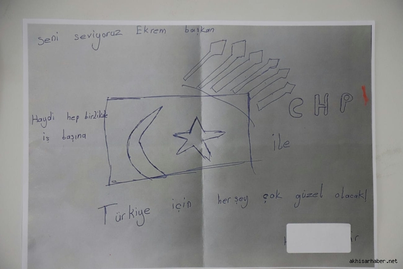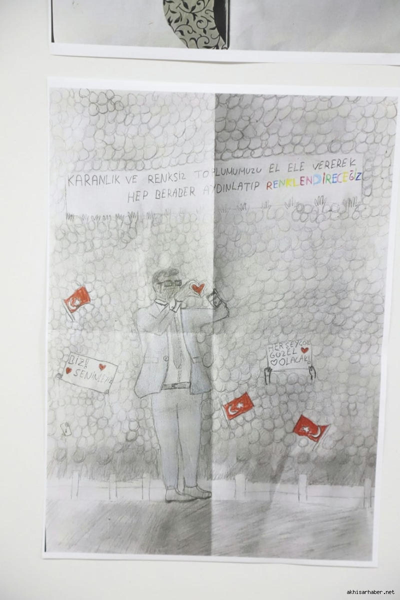 Hayriye Hacet’in ardından konuşan Akhisar Belediye Başkanı Besim Dutlulu ise, çocukların resimlerine duyduğu hayranlığı dile getirerek, “Bu sergide gördüğümüz her çizgi, çocuklarımızın adalete, özgürlüğe ve demokrasiye olan inancının bir göstergesidir. Ekrem Başkan sadece bir lider değil, bu ülkenin çocuklarının umudu olmuştur” ifadelerini kullandı.