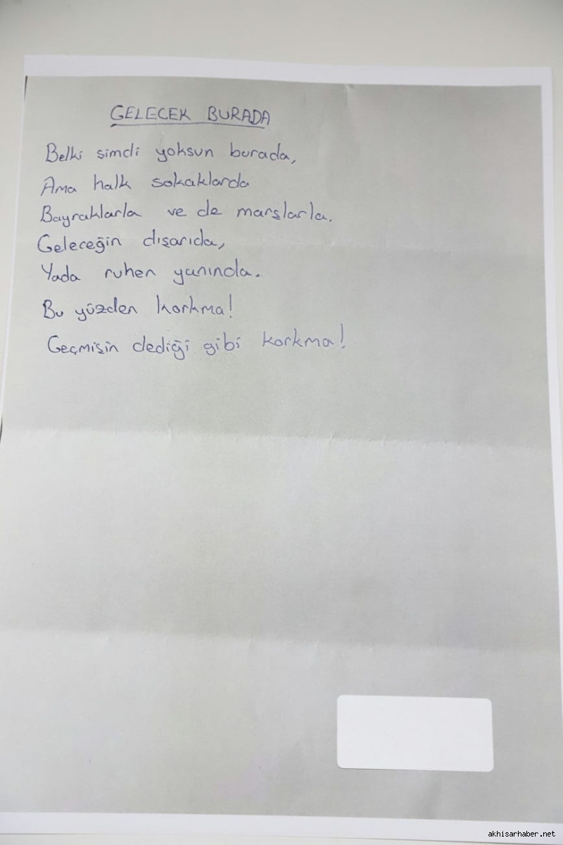 Yoğun bir katılımla gerçekleşen serginin açılışında ilk konuşmayı CHP Akhisar İlçe Başkanı Hayriye Hacet yaptı. Hacet, konuşmasında son günlerde yaşanan hukuksuzluklara dikkat çekerek, “İmamoğlu yalnız değildir, halkın gönlündedir. Bugün burada çocukların kaleminden dökülen umutları ve hayalleri görüyoruz. Bu, aslında gelecek kuşakların adalet ve özgürlük arzusunun en güzel ifadesidir” dedi.