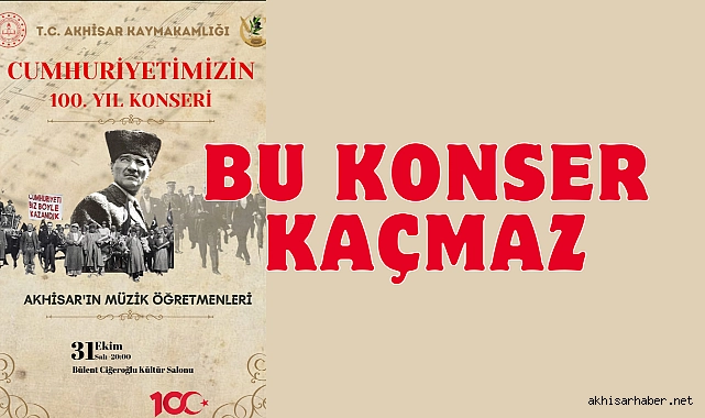 Akhisar Kaymakamlığı ve İlçe Milli Eğitim Müdürlüğü tarafından Cumhuriyetin 100.yılına özel Akhisar’ın Müzik Öğretmenlerinden oluşan koronun Cumhuriyetimizin 100.yılı isimli konseri 31 Ekim 2023 Salı günü saat 20.00’de Akhisar Belediyesi Bülent Ciğeroğlu Kültür Salonunda düzenleneceği duyuruldu.