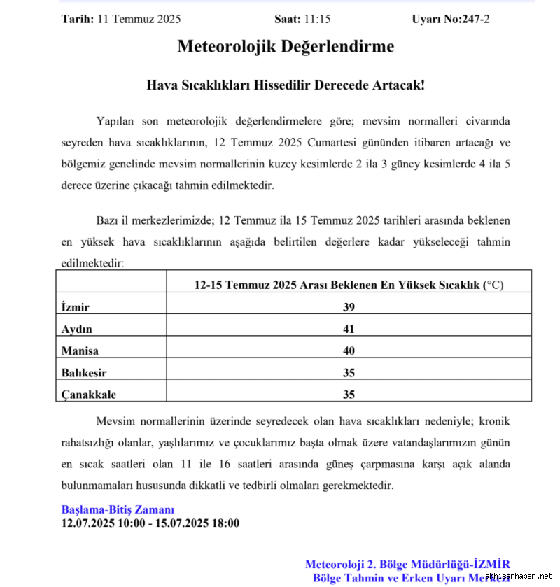 Meteoroloji 2. Bölge Müdürlüğü, 11 Temmuz 2025 tarihli uyarısıyla Ege Bölgesi'ni etkisi altına alacak yeni bir sıcak hava dalgasına karşı vatandaşları uyardı. 12 Temmuz Cumartesi gününden itibaren hava sıcaklıklarının mevsim normallerinin üzerine çıkacağı belirtilirken, bölge genelinde kuzey kesimlerde 2 ila 3 derece, güney kesimlerde ise 4 ila 5 derece artış bekleniyor.