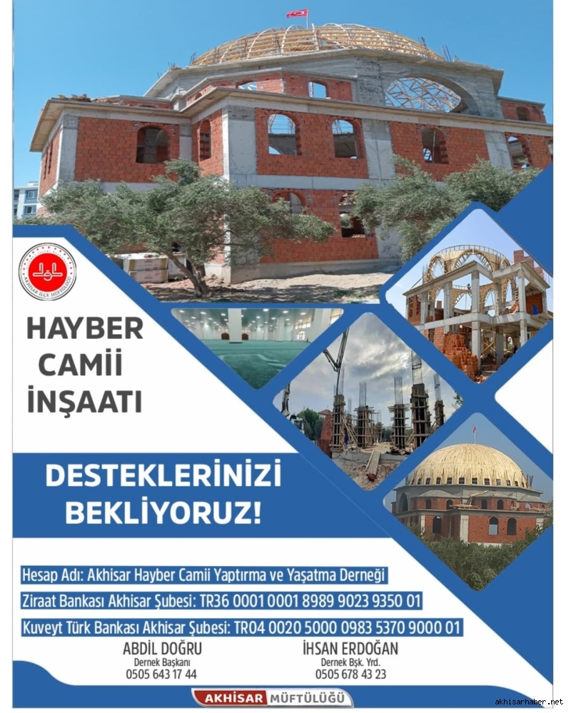 Akhisar’da yapımı devam eden ve hızla yükselen Hayber Camii, hayırsever vatandaşların destekleriyle tamamlanmayı bekliyor. Akhisar İlçe Müftülüğü öncülüğünde yürütülen cami inşaatı, bölge halkının ibadet ihtiyacını karşılayacak önemli bir eser olma yolunda ilerliyor.