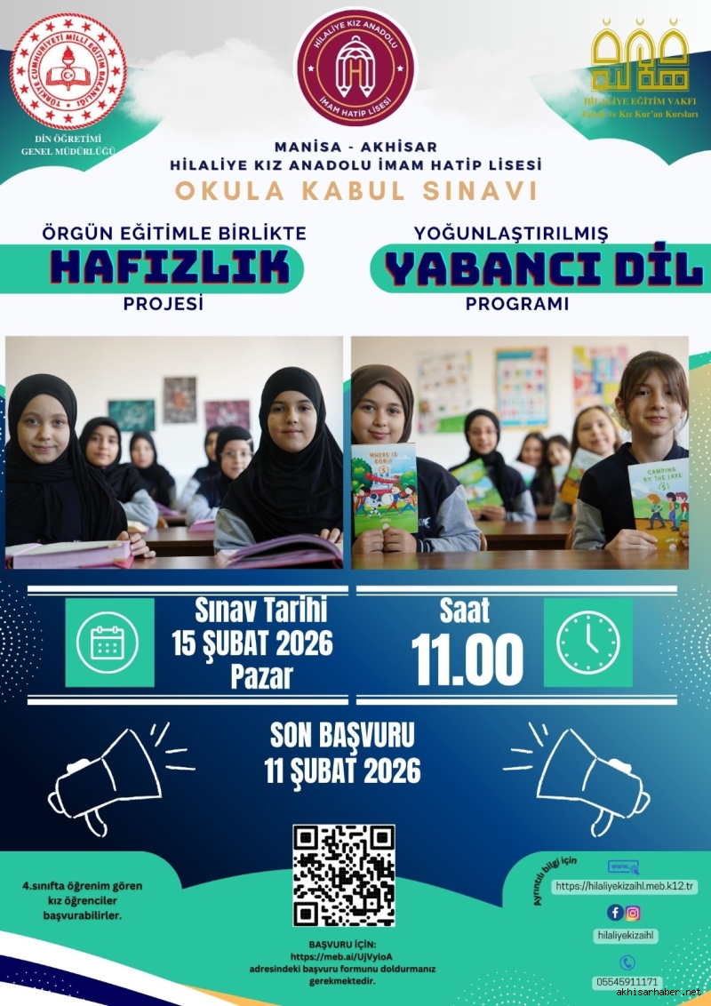 Manisa’nın Akhisar ilçesinde eğitim veren Hilaliye Kız Anadolu İmam Hatip Lisesi, örgün eğitimle birlikte hafızlık ve yoğunlaştırılmış yabancı dil programı için okula kabul sınavı düzenleyecek.