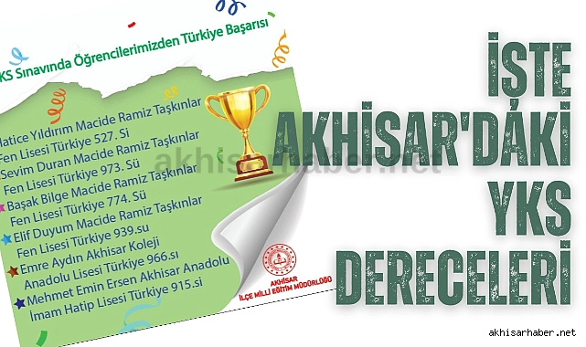 Akhisar İlçe Milli Eğitim Müdürlüğü'ne bağlı okullardaki öğrenciler, 2023 Yüksek Öğretim Kurumları Sınavı'nda (YKS) büyük başarı elde etti. Yapılan açıklamaya göre, Akhisarlı öğrencilerin YKS sonuçlarına göre elde ettikleri dereceler şu şekildedir: