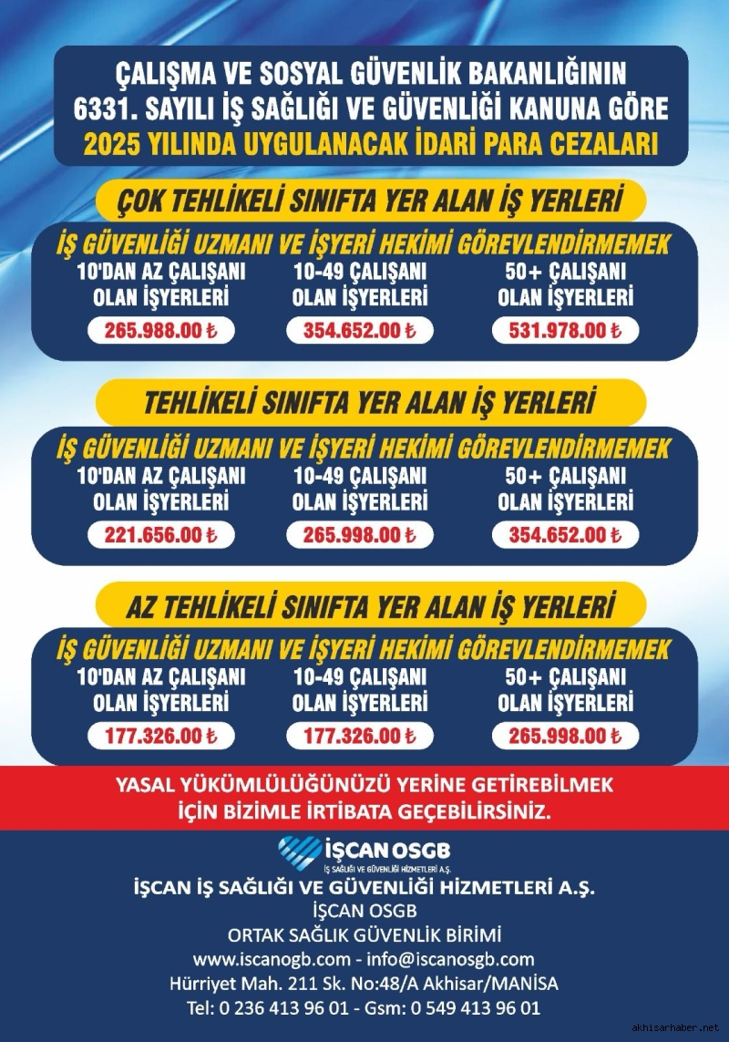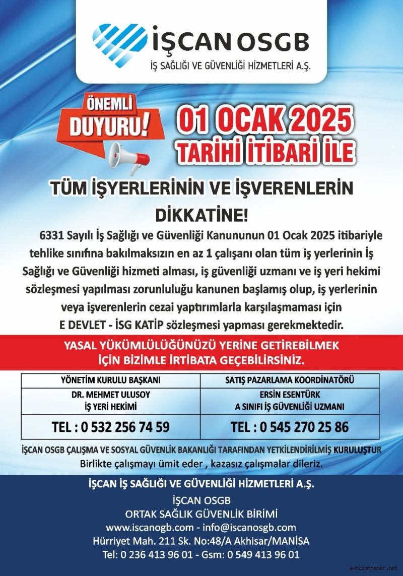 İşyerlerinin yasal yükümlülüklerini yerine getirebilmeleri için, yetkilendirilmiş Ortak Sağlık Güvenlik Birimleri (OSGB) ile çalışmaları öneriliyor. Akhisar’da faaliyet gösteren İŞCAN OSGB, iş sağlığı ve güvenliği konusunda uzman desteği sunarak işletmelerin mevzuata uygun hale gelmesine yardımcı oluyor.