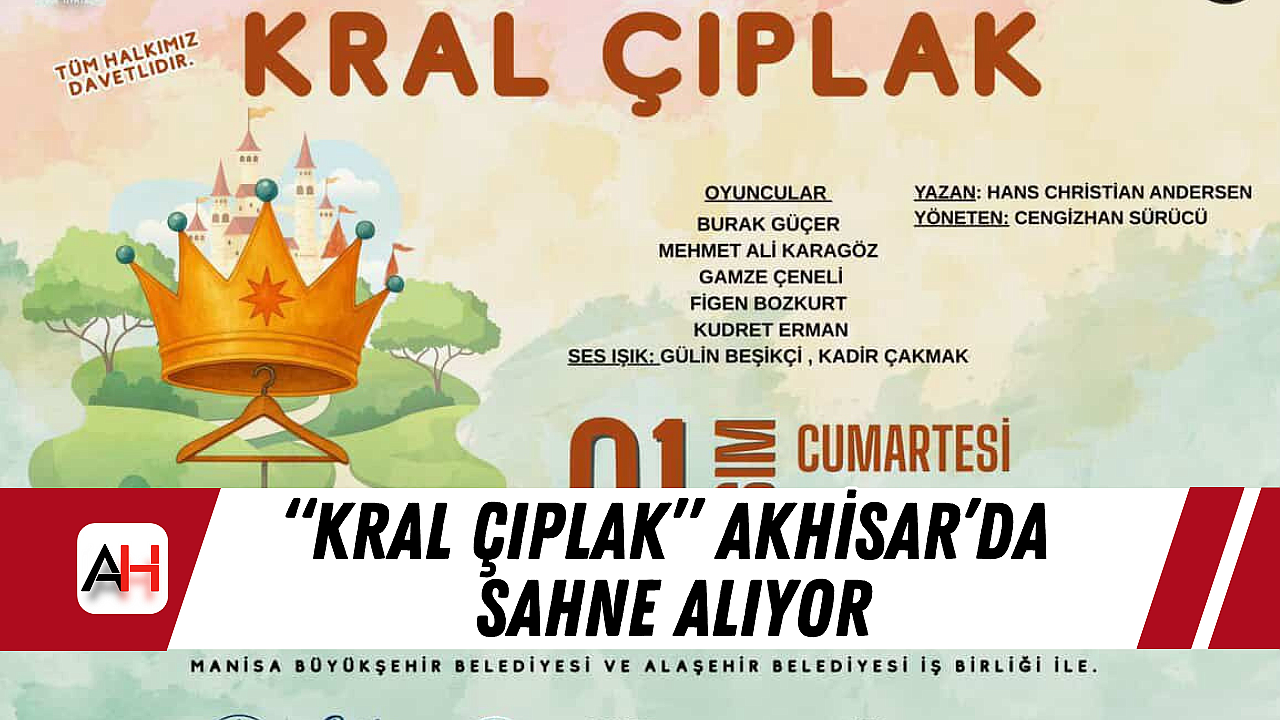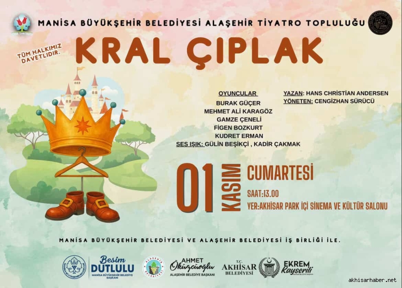 Manisa Büyükşehir Belediyesi Alaşehir Tiyatro Topluluğu, dünyaca ünlü yazar Hans Christian Andersen’in ölümsüz eseri Kral Çıplak oyununu Akhisar seyircisiyle buluşturuyor.