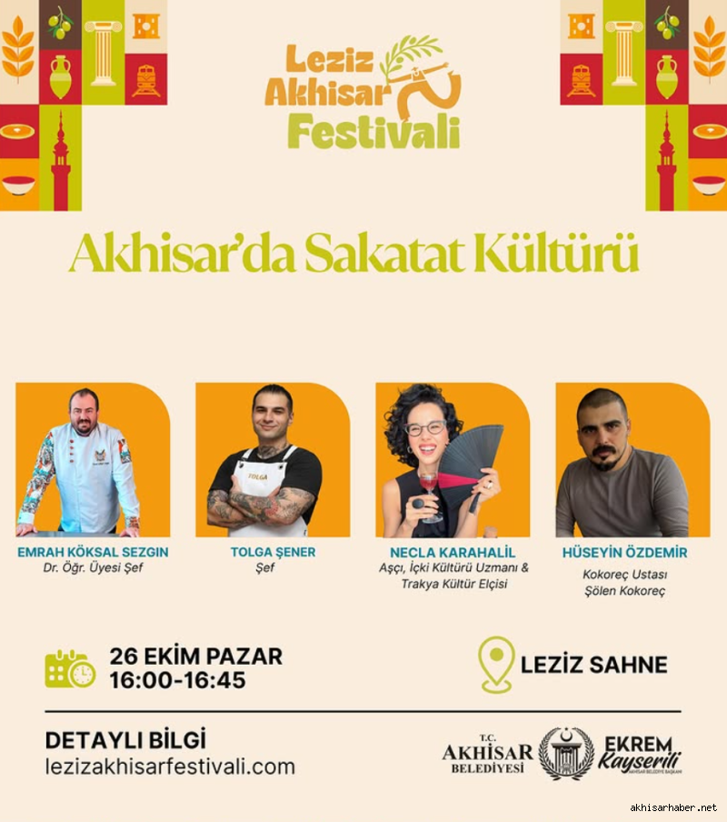 Akhisar Belediyesi tarafından düzenlenen Leziz Akhisar Festivali, bu yıl 25-26 Ekim 2025 tarihlerinde Şehit Yüzbaşı Necdi Şentürk Parkı (Şehir Parkı) içinde gerçekleşecek.