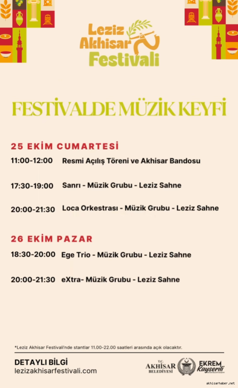 Festival süresince stantlar 11.00–22.00 saatleri arasında açık olacak. Ziyaretçiler, Akhisar’ın bin yıllık lezzet geleneğini tanıma, yöresel ürünleri tatma ve gastronomi dünyasının önde gelen isimleriyle buluşma fırsatı yakalayacak.