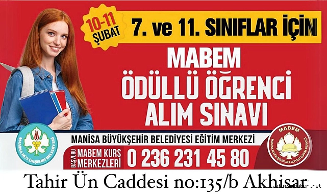 Manisa Büyükşehir Belediyesi Eğitim Merkezi (MABEM), 7. ve 11. sınıf öğrencileri için ödüllü öğrenci alım sınavı düzenliyor. Eğitimde fırsat eşitliği ve kaliteli öğrenim olanağı sunan MABEM, Akhisarlı öğrencilere yönelik bu sınavla başarılı gençleri desteklemeyi hedefliyor. Sınav, 10-11 Şubat tarihlerinde gerçekleştirilecek ve başarılı öğrencilere çeşitli ödüller sunulacak.