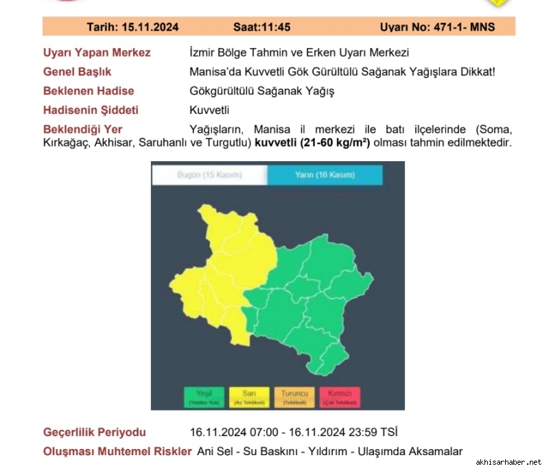 Yağışların 16 Kasım 2024 günü sabah saat 07:00 itibarıyla başlayıp, aynı gün gece yarısına kadar devam etmesi öngörülüyor. Kuvvetli yağışla birlikte ani sel, su baskını, yıldırım düşmesi ve ulaşımda aksama gibi risklerin yaşanabileceği konusunda vatandaşların dikkatli ve tedbirli olması isteniyor.