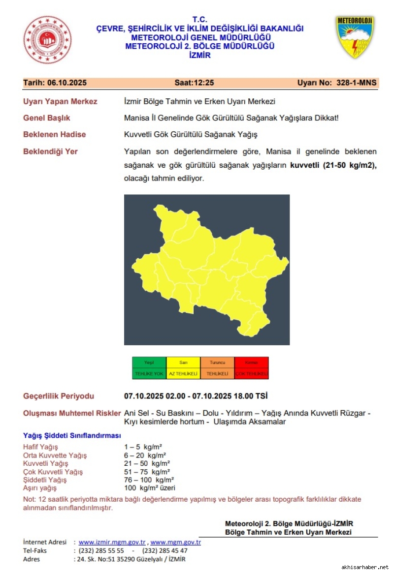 Meteoroloji Genel Müdürlüğü 2. Bölge Müdürlüğü, Manisa genelinde kuvvetli gök gürültülü sağanak yağış beklendiğini açıkladı. İzmir Bölge Tahmin ve Erken Uyarı Merkezi tarafından yapılan değerlendirmelere göre, yağışların 07 Ekim 2025 Salı günü sabah saatlerinden itibaren etkili olacağı tahmin ediliyor.Uyarıya göre, 21 ila 50 kilogram/metrekare aralığında yağış düşmesi beklenirken, özellikle il genelinde ani sel, su baskını, dolu, yıldırım, yağış anında kuvvetli rüzgâr ve ulaşımda aksamalar gibi olumsuzluklara karşı vatandaşların dikkatli ve tedbirli olması istendi.Yetkililer, kıyı kesimlerde hortum oluşma riski bulunduğuna da dikkat çekti. Kuvvetli yağışın 07 Ekim saat 02.00’den 07 Ekim 18.00’e kadar etkisini sürdürmesi bekleniyor.Meteoroloji raporunda yağış şiddeti sınıflandırması da paylaşıldı. Buna göre, hafif yağış 1-5 kg/m², orta kuvvette 6-20 kg/m², kuvvetli yağış 21-50 kg/m², çok kuvvetli yağış 51-75 kg/m², şiddetli yağış 76-100 kg/m² ve aşırı yağış 100 kg/m² üzeri olarak değerlendiriliyor.Manisa’nın tamamı, haritada sarı kodla “az tehlikeli” bölge olarak işaretlendi. Meteoroloji yetkilileri, vatandaşların özellikle dere yatakları, alt geçitler ve su taşkınlarının görüldüğü bölgelerden uzak durmasını, yağış anında trafiğe çıkacak sürücülerin hız ve takip mesafesine dikkat etmesini, tarımsal alanlarda da ürün koruma tedbirlerinin alınmasını tavsiye etti.Meteoroloji 2. Bölge Müdürlüğü - İzmir, vatandaşları SMS, internet ve sosyal medya kanalları üzerinden anlık bilgilendirmelerle haberdar etmeyi sürdürecek.Haber Merkezi
