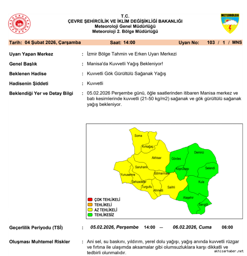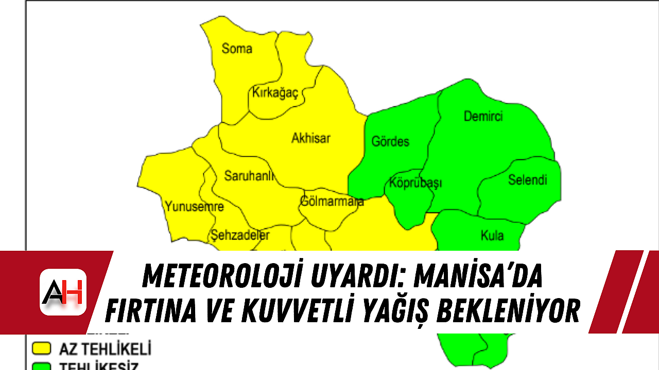 T.C. Çevre, Şehircilik ve İklim Değişikliği Bakanlığı Meteoroloji Genel Müdürlüğü, Manisa ili genelini kapsayan iki ayrı meteorolojik uyarı yayımladı. İzmir Bölge Tahmin ve Erken Uyarı Merkezi tarafından yapılan açıklamalarda, kuvvetli rüzgâr ve fırtınanın yanı sıra kuvvetli gök gürültülü sağanak yağış beklendiği bildirildi.