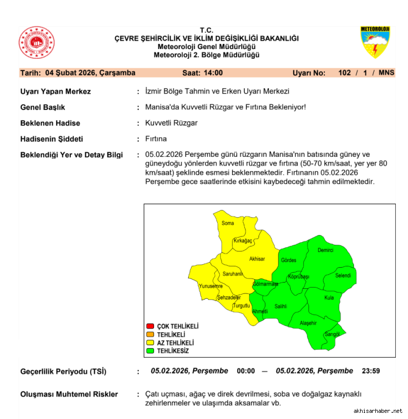 Meteoroloji tarafından yapılan ilk uyarıya göre, 5 Şubat 2026 Perşembe günü Manisa’nın batı kesimlerinde rüzgârın güney ve güneydoğu yönlerden kuvvetli, yer yer fırtına şeklinde esmesi bekleniyor. Rüzgâr hızının saatte 50–70 kilometreye, yer yer ise 80 kilometreye kadar çıkabileceği ifade edilirken, fırtınanın Perşembe gece saatlerinde etkisini kaybetmesinin öngörüldüğü belirtildi.
